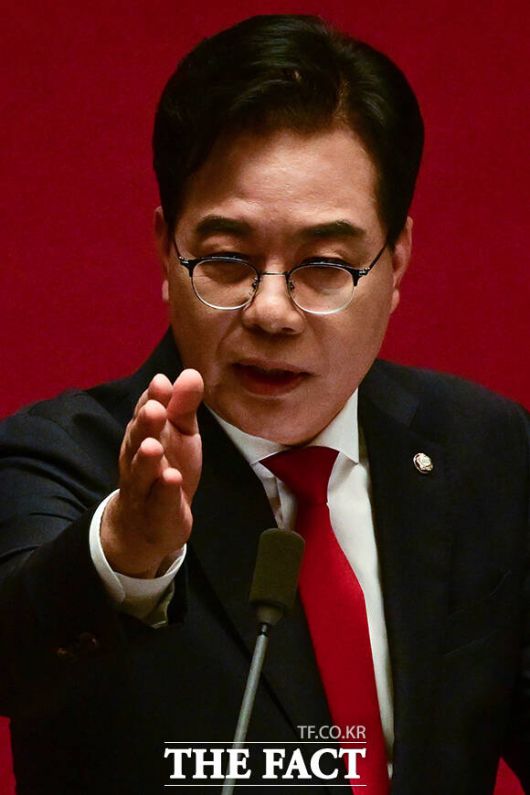 [더팩트ㅣ국회=남윤호 기자] 송언석 국민의힘 원내대표가 10일 오전 서울 여의도 국회에서 교섭단체 대표연설을 하고 있다.