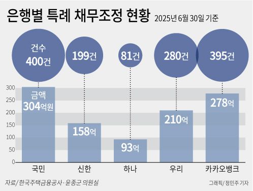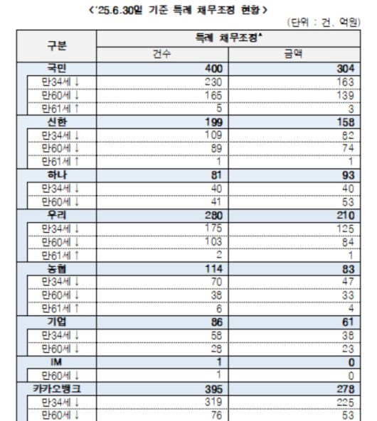 한편, 한국주택금융공사의 '경·공매 종료 후 기존 전세대출 미상환금 20년간 무이자 분할상환 지원 신청 현황'에 따르면 올해 6월30일 기준 은행별 전세사기 피해자 지원을 위한 특례채무조정 건수 및 금액은 국민은행이 400건·304억원으로 제일 많았고, 카카오뱅크가 395건·278억원으로 뒤를 이었다. 또한 국민은행에서 전세사기 피해 특례채무조정을 받은 만34세 이하 청년들이 230건으로 전체의 57.5%였는데, 카카오뱅크 만34세 이하 청년이 319건에 달해 80.7%에 달했다. 타 은행은 ▲우리은행 280건·210억원 ▲신한은행 199건·159억원 ▲하나은행 81건·91억원 등으로 나타났다.
