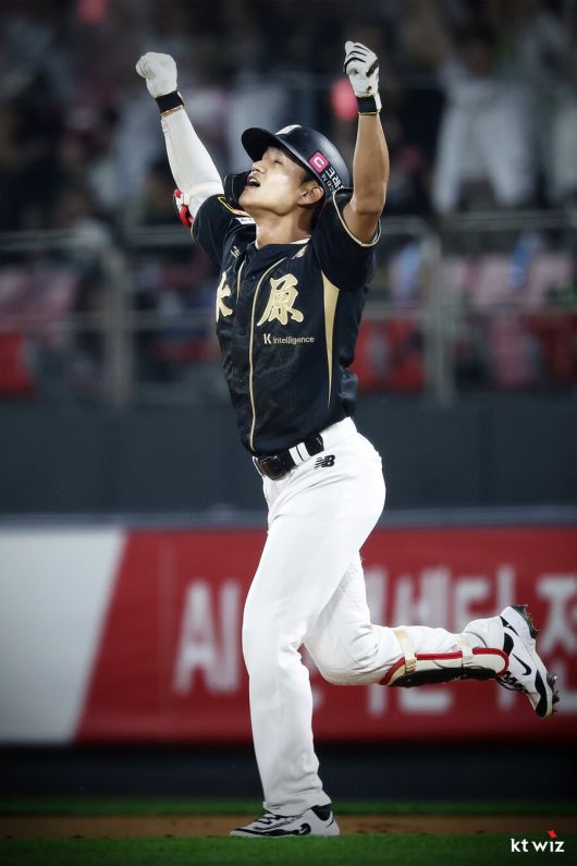 안치영은 9일 수원 KT위즈파크에서 열린 2025 신한 SOL뱅크 KBO 리그 두산과의 경기에서 3회말 우월 2점홈런을 쏘아 올리며 프로 데뷔 9년차에 통산 1호 홈런을 쏘아 올리는 감격의 순간을 맞았다.