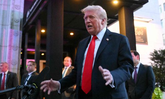 도널드 트럼프 미국 대통령이 9일(현지시간) 수도 워싱턴 DC 시내에서 핵심 측근들과 만찬을 즐기기 위해 고급 식당 ‘조스’(Joe’s)에 입장하기 전 취재진의 질문에 답하고 있다. AFP연합뉴스 |