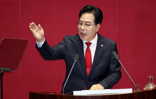 국민의힘 송언석 원내대표가 10일 서울 여의도 국회 본회의에서 교섭단체 대표 연설을 하고 있다. 연합뉴스 |