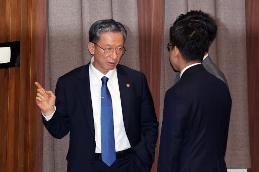 정성호 법무부 장관이 10일 서울 여의도 국회 본회의장에서 김영훈 고용노동부 장관, 배경훈 과학기술정보통신부 장관과 대화하고 있다./연합뉴스 |