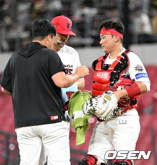 [OSEN=광주, 이대선 기자] 10일 오후 광주-기아 챔피언스필드에서 2025 신한 SOL Bank KBO리그 KIA 타이거즈와 삼성 라이온즈의 경기가 열렸다. KIA는 네일, 삼성은 가라비토를 선발 투수로 내세웠다. 5회초 1사 2루에서 마운드를 방문한 KIA 김태군이 네일과 이야기를 나누고 있다. 2025.09.10 /sunday@osen.co.kr