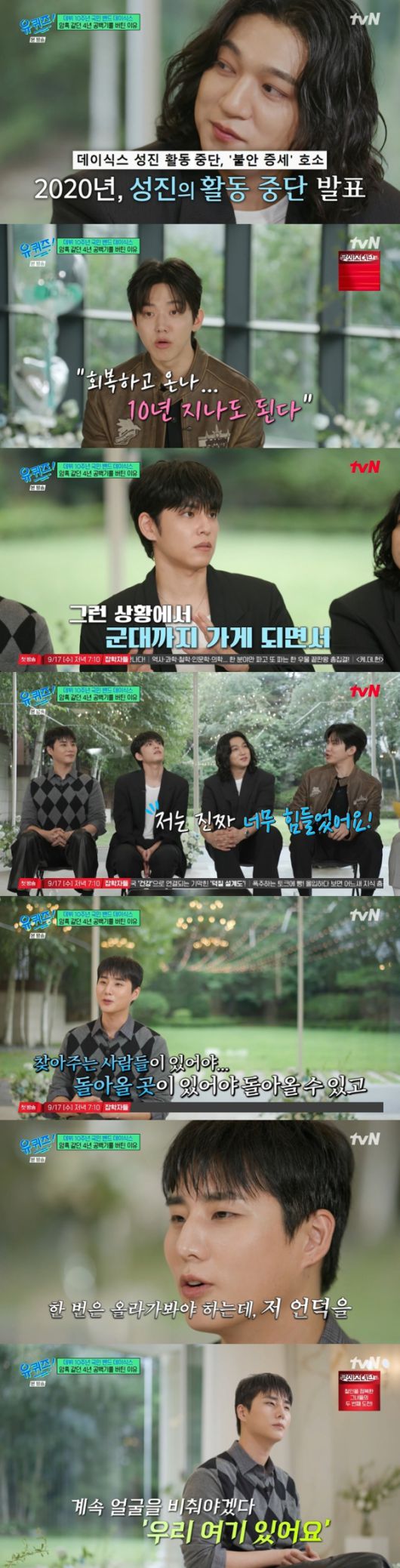 원필은 멤버들의 연이은 입대로 공백기를 겪은 것을 떠올리며 "성진이 형이 제일 걱정이 됐고, 그런 게 쌓인 상태에서 군대를 가게 됐다. 불안감이 없지 않아 있었다"고 말했다. 도운은 "저는 진짜 너무 힘들었다. 형들이 없으니까 제가 할 게 없더라. 드럼을 치는 데도 행복하지 않았다. 잠깐의 위로만 되고 재미가 없으니까 그때 깨달았다. '내가 데이식스의 드럼을 쳐서 행복했던 거구나'"라고 솔직하게 이야기했다.