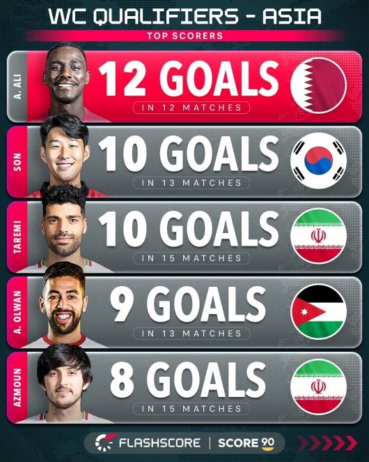 손흥민의 밑으로는 이란의 공격 듀오 타레미(10골)와 아즈문(8골)이 각각 3위와 5위를 차지했고, 요르단 공격의 핵심 올완이 9골로 4위에 랭크됐다. 타레미는 손흥민과 득점 기록이 같지만 손흥민보다 2경기 더 출전했기 때문에 손흥민에게 2위 자리를 내줬다.