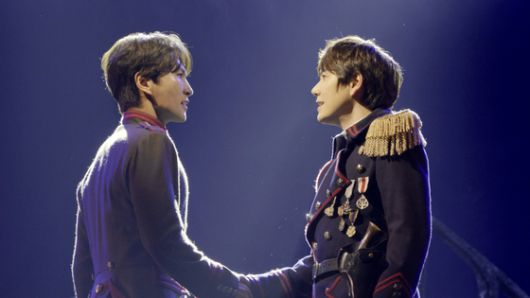 공연 실황 영화 ‘프랑켄슈타인: 더 뮤지컬 라이브’의 한 장면. 앙리 역의 배우 박은태(왼쪽)와 빅터 역의 규현을 근접 촬영했다. 18일 개봉한다. [사진 EMK뮤지컬컴퍼니] |