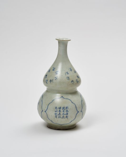 18~19세기 초 백자 '표형문자입주병'. 33×18×18cm. 몸체에 푸른 글씨로 술의 정취와 절제의 미덕을 노래하는 한시가 적혀있다. /학고재 |