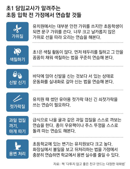 초등학교에 입학할 때 부모 못지않게 아이들도 걱정이 많다. 친구를 사귈 수 있을지, 선생님께는 어떻게 얘기해야 할지 고민이다. 어린이집, 유치원과 다른 환경이라 초등학교 입학부터 선생님, 친구들과 대화하는 법을 일러주고 가정에서 시간을 두고 연습할 필요가 있다.