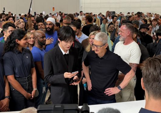 보이그룹 에이티즈의 윤호(앞줄 가운데)가 지난 9일(현지시간) 미국 캘리포니아주 쿠퍼티노 애플 파크에서 팀 쿡(오른쪽) 애플 최고경영자(CEO)와 아이폰 신제품에 대해 이야기를 나누고 있다. 애플은 이날 아이폰17 시리즈와 아이폰 에어, 애플워치11과 울트라3, 에어팟 프로3 등의 신제품을 공개했다. 연합뉴스 |