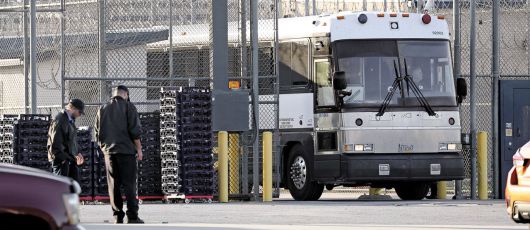 미국 조지아주 현대차·LG에너지솔루션 배터리 공장 건설 현장에서 미 이민 당국에 체포된 한국 근로자 300여 명이 수감된 포크스턴 수감 시설에서 버스가 나오고 있다. 근로자들은 애초 10일(현지 시각) 전세기편으로 한국으로 돌아올 예정이었나 석방이 지연됐다. /연합뉴스 |