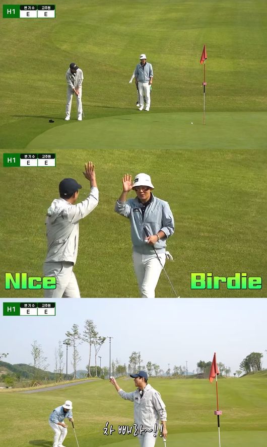 변기수는 “절대 방송 찾아보고 그러지 말라”며 고주원을 감싸는 듯 놀리는 모습이었지만, 시작과 동시에 반전이 벌어졌다. 고주원이 멋진 버디샷을 날리며 변기수와 무려 4타 차이로 첫번째 홀을 마무리한 것. 변기수도 “잘 친다. 3년 전의 고주원이 아니다”라며 감탄을 금치 못했다.