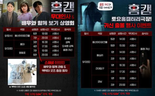 13일 토요일에는 서울 전역의 CGV가 '토요홈캠터리극장'으로 변신한다. '홈캠'에 등장한 미스터리한 여인이 극장에 출몰하기 때문. CGV용산아이파크몰, 영등포, 홍대입구, 왕십리, 건대입구, 강남에서 오후 2시부터 8시까지 지정된 회차에 관객을 찾아가 궁화신당이 쓴 액막이 부적 스티커 3종을 건 게임, 귀신과 심령 셀카 찍기 등 깜짝 이벤트를 진행한다. 여기에 CGV 홍대와 영등포에서는 상영 전 윤세아, 권혁, 오세호 감독이 무대인사를 가질 예정이다.