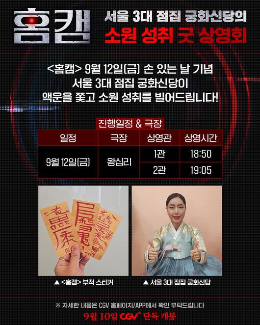 신선한 설정만큼 독특한 홍보로 이목을 집중시켜 온 '홈캠'이 다양한 콘셉트 상영회로 개봉 후 캠페인을 이어간다. 오는 12일 CGV왕십리에서는 국가무형문화제 104호 전수자이자 서울 3대 점집으로 유명한 궁화신당이 직접 관객과 만나 소원 성취를 빌어주는 ‘소원 성취 굿 상영회’가 열린다. 궁화신당은 '홈캠'에 무속 자문가로 참여한 인연을 계기로 행운 부적 3종 굿즈 제작과 이번 굿 상영회 출연까지 함께 하게 됐다. 재미있는 영화도 보고, 전국에 소문난 용한 무당 선생님의 영험한 기까지 받을 수 있는 1석 2조의 이벤트가 될 것이다.