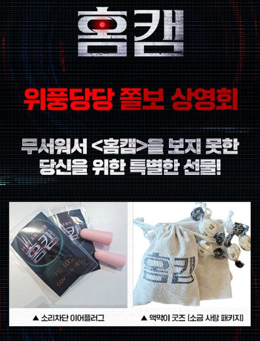 차주 주말은 겁은 많지만 '홈캠'이 궁금한 쫄보 관객을 위한 ‘위풍당당 쫄보 상영회’가 준비 중이다. ‘위풍당당 쫄보 상영회’를 예매한 관객에게는 무서운 사운드를 차단해 줄 이어플러그와 귀신을 쫓아줄 액막이 소금 사탕을 증정하며, 특별히 극장 내부 조명도 켜고 관람할 수 있다.