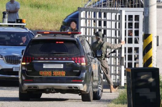 10일 오후 경기도 파주시 육군 모 부대에서 훈련 중 폭발 사고가 일어나 폭발물 처리반이 위병소를 통과하고 있다. 연합뉴스 |
