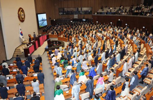 지난 1일 서울 여의도 국회에서 열린 정기국회 개회식에서 한복과 상복을 입은 여야 의원들이 애국가를 부르고 있다. /사진=연합뉴스 |