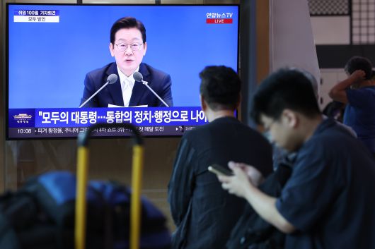 11일 오전 서울 용산구 서울역 대합실에서 시민들이 이재명 대통령 취임 100일 기자회견 방송을 보고 있다./연합뉴스 |