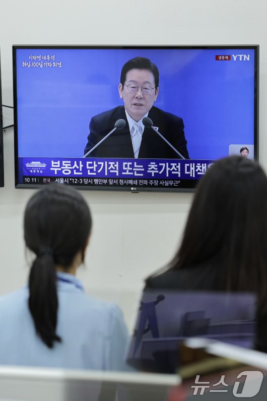 (서울=뉴스1) 신웅수 기자 = 11일 서울 여의도 국회에서 더불어민주당 당직자들이 이재명 대통령의 취임 100일 기자회견 생중계를 지켜보고 있다. 2025.9.11/뉴스1phonalist@news1.krCopyright ⓒ 뉴스1. All rights reserved. 무단 전재 및 재배포, AI학습 이용 금지.