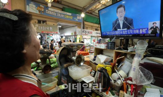 [이데일리 방인권 기자] 이재명 대통령의 취임 100일 기자회견이 열린 11일 서울 서대문구 인왕시장에서 상인들이 TV를 통해 기자회견 중계를 시청하고 있다.