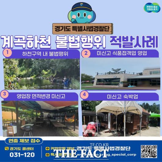 [더팩트ㅣ수원=이승호 기자] 경기도 특별사법경찰단은 여름철 계곡과 하천 휴양지를 사유화하고 불법 영업을 한 업주 12건을 적발했다고 11일 밝혔다.