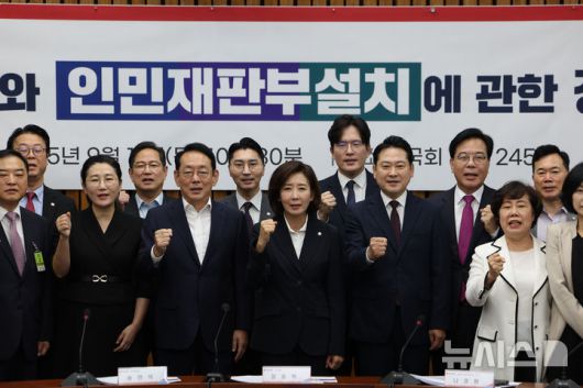 [서울=뉴시스] 김명년 기자 = 11일 오전 서울 여의도 국회에서 열린 국민의힘 '검찰해체와 인민재판부설치에 관한 청문회'에서 참석자들이 기념촬영하고 있다. 2025.09.11. kmn@newsis.com |