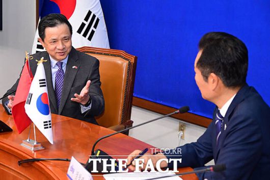 정청래 대표와 만나 인사말하는 다이빙 주한중국대사. |