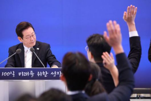 이재명 대통령이 11일 청와대 영빈관에서 열린 취임 100일 기자회견 '회복을 위한 100일, 미래를 위한 성장'에서 질문을 받고 있다. 연합뉴스 |