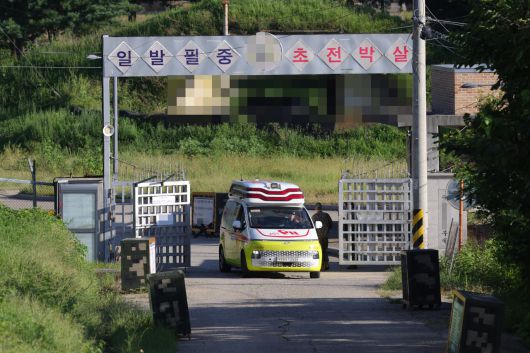 지난 10일 오후 경기도 파주시 육군 모 부대에서 훈련 중 폭발 사고가 일어나 구급차가 위병소를 통과하고 있다. [연합뉴스] |