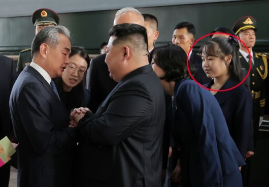 중국 전승절 80주년 열병식에 참석하기 위해 방중한 김정은(가운데) 북한 국무위원장이 지난 2일 베이징역에 도착해 영접 나온 왕이(왼쪽) 중국 외교부장과 인사하고 있다. 김 위원장 뒤에는 딸 주애(빨간 원)가 서 있다. 이 사진은 북한 주민들도 볼 수 있는 노동신문 3일 자에 공개됐다. 평양 노동신문 뉴스1 |