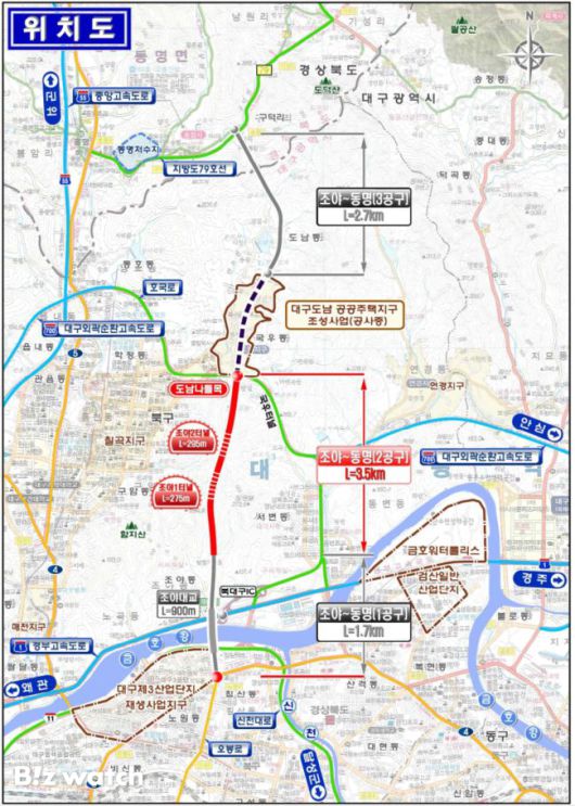 조야~동명 광역도로 건설공사는 총연장 7.9㎞, 폭 20m, 왕복 4차로 규모다. 공사 구간은 △1공구(1.7㎞, 침산동~조야동) △2공구(3.5㎞, 조야동~도남공공주택지구), △3공구(2.7㎞, 도남공공주택지구~칠곡 동명면)로 나뉜다. 전체 구간에는 교차로 6곳과 터널 3곳이 설치된다.