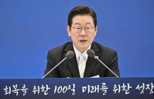 이재명 대통령이 취임 100일째가 되는 11일 서울 청와대 영빈관에서 내·외신 기자 150여명이 참석한 가운데 ‘회복을 위한 100일, 미래를 위한 성장' 기자회견을 가졌다. 먼저 취임 100일 간의 성과를 담은 영상을 시청하고, 모두발언을 진행했다.