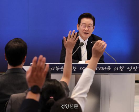 이재명 대통령이 취임 100일째가 되는 11일 오전 서울 청와대 영빈관에서 ‘회복을 위한 100일, 미래를 위한 성장’이라는 슬로건을 걸고 기자회견을 갖고 있다. 김창길 기자 |