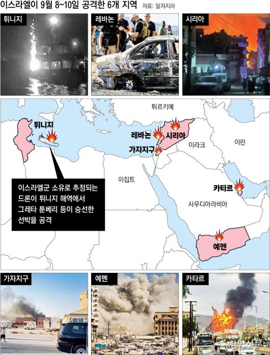 이스라엘은 2023년 10월7일 팔레스타인 무장정파 하마스 공격으로 가자지구 전쟁이 발발한 이후 가자지구를 비롯, 레바논·시리아·예멘·이란·카타르 등 5개국을 공습하며 중동 지역 긴장을 최고조로 끌어올리고 있다.
