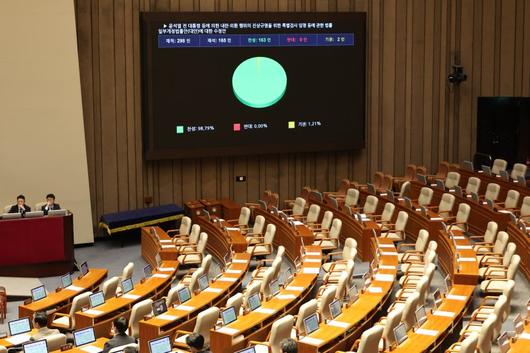 이날 열린 국회 본회의에서 3대 특검법은 민주당 주도로 통과됐다. 앞서 지난 10일 여야 원내대표가 합의한 수사 기간을 추가로 연장하지 않고 수사 인력 증원도 필요한 인원에 한해서만 증원키로 한 수정안은 민주당 내 이견으로 폐기됐고, 당초 민주당이 추진했던 원안대로 '수사 기간·인력 확대' 조항이 담긴 특검법 개정안을 처리했다.