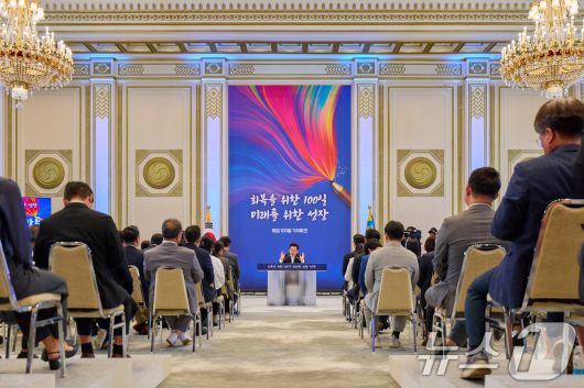 (서울=뉴스1) 허경 기자 = 이재명 대통령이 11일 청와대 영빈관에서 '회복을 위한 100일, 미래를 위한 성장'을 주제로 열린 취임 100일 기자회견에서 기자들의 질문에 답변하고 있다. (대통령실 제공. 재판매 및 DB 금지) 2025.9.11/뉴스1