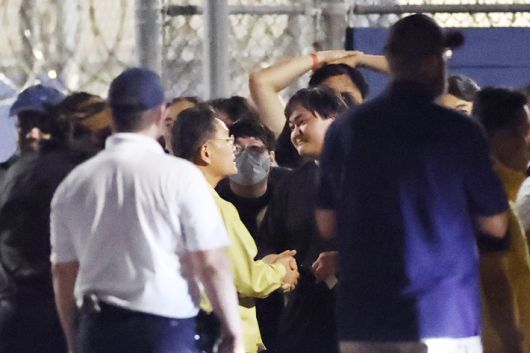 이민단속으로 체포됐던 현대차-LG엔솔 배터리공장 건설 현장 직원들이 11일(현지시간) 미국 조지아주 포크스턴의 이민세관단속국(ICE) 구금시설에서 나오며 조기중 워싱턴 총영사와 손을 잡고 대화하고 있다. 연합뉴스 |