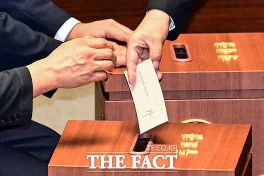 [더팩트ㅣ국회=남윤호 기자] 권성동 국민의힘 의원이 11일 오후 서울 여의도 국회에서 열린 본회의에서 자신의 체포동의안에 대해 찬성을 의미하는 '가'를 적어 투표하고 있다.