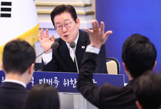 하얀 넥타이를 맨 이 대통령은 오전 10시 회견장에 들어서며 맨 앞줄 기자들과 일일이 악수를 나눴다. 지난달 국민임명식 때와 같은 흰색 넥타이로, ‘초심을 잃지 않겠다’는 메시지를 담은 것으로 전해졌다.