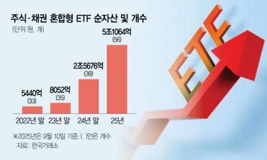 11일 한국거래소에 따르면 전날 기준 주식과 채권 모두에 투자하는 혼합자산형 ETF의 순자산은 5조 1064억 원으로 지난해 말 2조 5676억 원 대비 2배 가까이 증가했다. 약 1년 9개월 전인 2023년 말과 비교했을 때는 약 6배 폭증한 수치다.