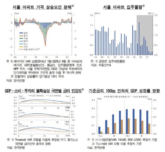 한은에 따르면 올해 상반기 서울 아파트 가격 상승분의 26% 정도가 금리 인하 때문이었다. 나머지 74%는 △신규 주택 공급 부족 △규제 수준 완화 △집값 상승 기대 심리 등에 의한 것으로 추정됐다.