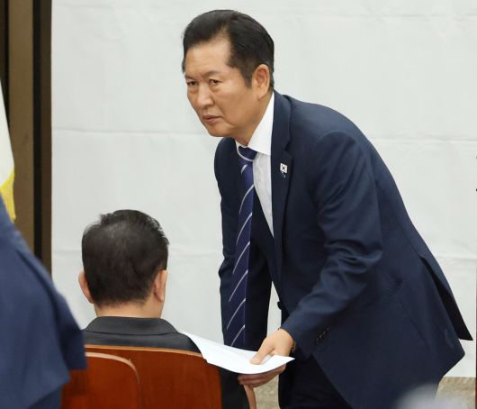 정청래 더불어민주당 대표(오른쪽)가 11일 국회에서 열린 비공개 의원총회에서 김병기 원내대표와 이야기를 나누고 있다. 박민규 선임기자 |