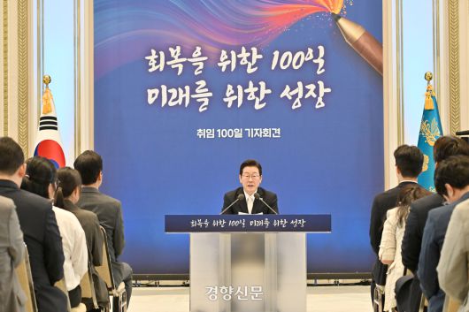 이재명 대통령이 취임 100일째가 되는 11일 청와대 영빈관에서 ‘회복을 위한 100일, 미래를 위한 성장’이라는 슬로건으로 기자회견을 하고 있다. 김창길 기자 |