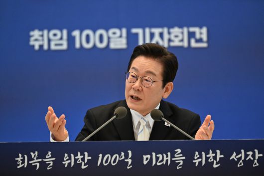 이재명 대통령이 11일 청와대 영빈관에서 취임 100일 기자회견 '회복을 위한 100일, 미래를 위한 성장'을 하고 있다. 대통령실통신사진기자단 |