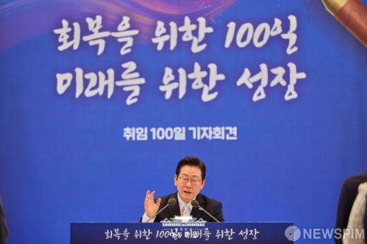 질의에 답하는 이재명 대통령, 취임 100일 기자회견