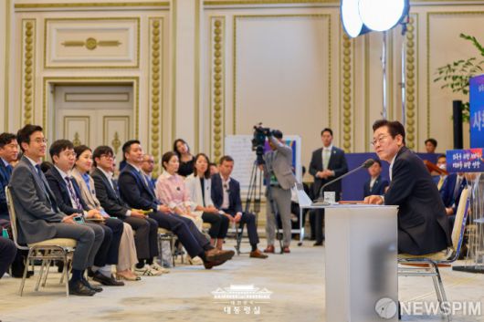 기자회견 자리한 이재명 대통령