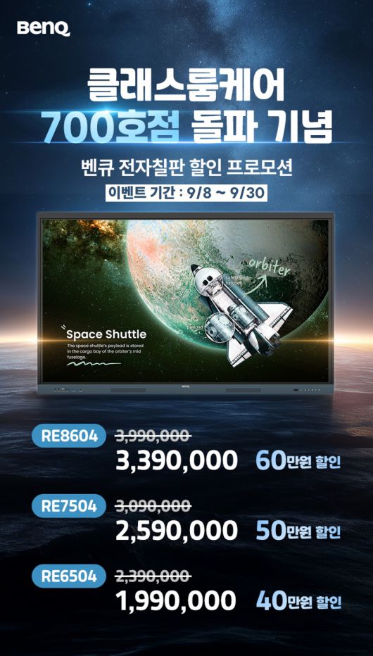 [디지털포스트(PC사랑)=임병선 기자] 글로벌 디스플레이 전문 브랜드 벤큐(지사장: 소윤석)는 자사 전자칠판 구매 고객을 대상으로 한 클래스룸케어 인증 프로그램이 700호점을 돌파했다고 발표했다. 이를 기념해 9월 8일부터 9월 30일까지 할인 프로모션을 진행한다. 이번 행사에서는 벤큐 전자칠판 RE 시리즈 주요 모델을 최대 60만원 할인된 가격으로 구매할 수 있다.
