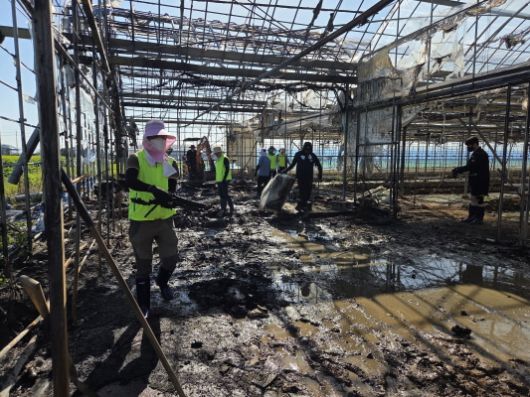 ▲전북농협 임직원들이 기록적인 집중호우로 큰 피해를 입은 군산 농가를 찾아 하우스 내 잔해물을 치우고 있다. ⓒ전북농협 |