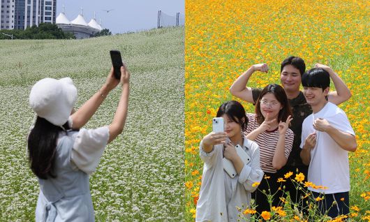 하늘이 유난히 푸르고 맑게 보인 11일 인천 연수구 선학동 메밀꽃밭(왼쪽)과 황화코스모스가 만개한 경기 남양주시 한강시민공원 삼패지구를 찾은 시민들이 사진을 찍으며 초가을 정취를 즐기고 있다. 인천·남양주=이제원 선임기자·이재문 기자 ⓒ 세상을 보는 눈, 세계일보