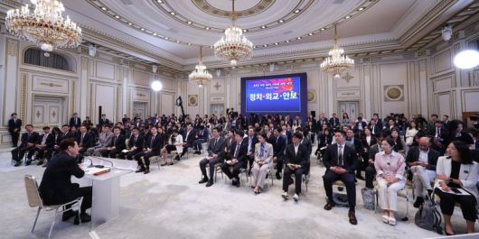 이재명 대통령이 11일 청와대 영빈관에서 열린 취임 100일 기자회견 '회복을 위한 100일, 미래를 위한 성장'에서 취재진 질문에 답하고 있다. 대통령실통신사진기자단 |