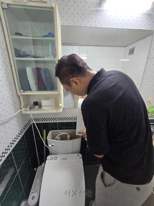 강원 강릉 교동의 한 아파트에 사는 강태근(가명)씨가 지난 10일 출근 전 제습기에 있는 물로 변기를 채우고 있다. |
